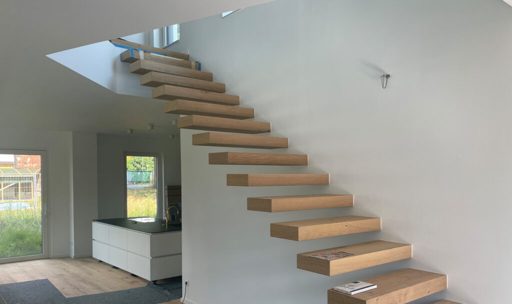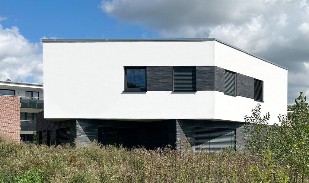 Emporgehoben sitzt das Obergeschoss als unregelmäßiges Fünfeck auf dem dunkel geklinkerten Erdgeschoss. Mit den gezielten Vor- und Rücksprüngen gewinnt das übergreifende Geschoss eine eigene Dynamik und schmiegt sich in das eher untypisch trapezförmige Baufeld. Die Kubatur bietet damit überdachte Zugänge, einen baulichen Sonnenschutz und inszenierte Ausblicke in die grüne Umgebung.